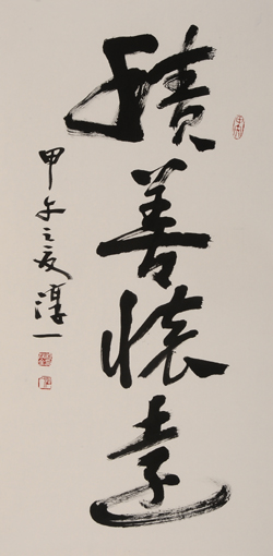 茂全的書法沉穩(wěn)靈動,結(jié)構(gòu)嚴謹;行筆灑脫流暢,成竹在胸,積四十余年的功夫在里面,可以說是修來的果、悟出的道、品出的禪,個中三昧,得之不易。溥杰先生為其題詞“味從勤里得!笔拕谙壬Q之為“后起之秀”。大康先生送字三個,叫“池水墨”,涮筆洗硯竟至池水如墨,功夫下到這份上,能無得乎?