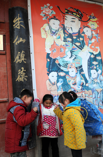 幾名兒童在朱仙鎮(zhèn)一家年畫作坊外玩耍。 |
