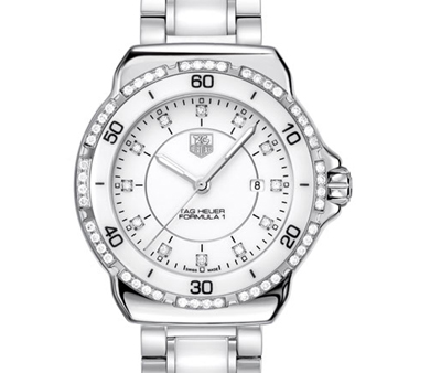 陶瓷象征永恒,質感細膩,擁有極強的防劃痕,防敏感和堅固防銹的特性,近年來已成為高級鐘表界的首選材質。泰格豪雅F1陶瓷系列專為女性打造,秉承一貫簡約精致的設計風格,旋入式表冠配以藍寶石水晶表鏡,所有時標均采用手工壓嵌,12顆頂級鉆石對應著時標更顯高貴典雅,刻面時針和分針以及時標頂端均帶熒光標記,3點位置配有日期顯示窗,使得該款腕表兼具很強的實用性及美感。蝴蝶式表扣由陶瓷與不銹鋼打造而成,更顯精美絕倫。