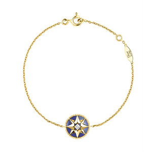 Vents(羅盤玫瑰)系列正是基于這些故事的靈感之作!拔易畛踉O想的是一枚小小的圖案吊墜,后來我覺得設計成圓形圖案的徽章樣式更具紀念意義!边@位迪奧高級珠寶部藝術總監(jiān)如是說!八笳髀眯,其中蘊含著克里斯汀·迪奧的星星和那段幸運符的故事,同時包含了迪奧先生最愛的玫瑰花元素。品牌的歷史精髓都隱含在其中!庇牲S金和珍珠母貝、青金石或綠松石、玫瑰金和粉色蛋白石精心打造,這些美輪美奐的珠寶仿佛在輕訴品牌的傳奇故事。圓形徽章圖案周圍飾有一圈金色稻穗,旨在向帆纜和大海致敬。吊墜一面為寶石,一面為羅盤玫瑰圖案,正反面隨著佩戴者的舉手投足交替顯現(xiàn)。圍繞同主題打造的手鏈和長短款項鏈,大大豐富了這一系列的選擇!癛ose
