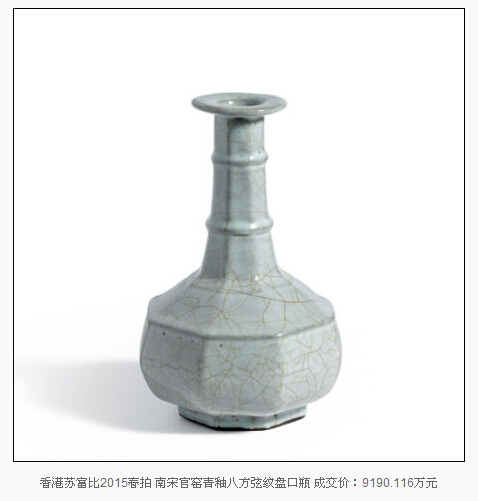 2015年已經(jīng)過半,藝術(shù)市場上各大拍行春拍也相繼收槌。瓷器板塊,香港蘇富比春拍一件南宋官窯青釉八方弦紋盤口瓶以1億1388萬港元(約合9190萬人民幣)的成交價(jià)占據(jù)2015上半年的排行榜頭名,這一價(jià)格也成為宋代瓷器歷史第三高拍賣成交價(jià)。高古瓷器的市場走高也被相當(dāng)一部分業(yè)內(nèi)人士認(rèn)為是古瓷市場回歸理性的征兆。