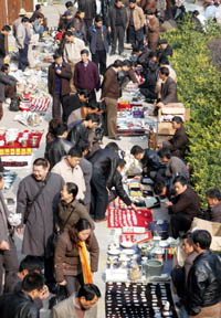 據(jù)了解,目前全國各地大大小小的古玩市場(chǎng)不下幾百個(gè),多數(shù)由解放前就一直存在的舊貨市場(chǎng)自發(fā)轉(zhuǎn)化而來。最初,這些市場(chǎng)堪稱自由市場(chǎng),舊書字畫、古董工藝品,無所不賣。漸成氣候以后,有人稱它們?yōu)榕f貨市場(chǎng),也有人稱之為工藝品市場(chǎng)、還有的叫它文化市場(chǎng)。在太原的南宮市場(chǎng),如今不僅有地?cái)偅有裝修氣派的收藏文化廣場(chǎng)大樓。但認(rèn)真考察就會(huì)發(fā)現(xiàn),工藝品、仿制品、舊貨、小玩意兒……包羅萬象,似乎哪個(gè)稱謂都無法明確概括它們的實(shí)際狀況。