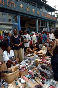 在喀麥隆經(jīng)濟首都杜阿拉的中國商城,當?shù)匦∝溤谑圪u中國商品。本報記者 楊磊