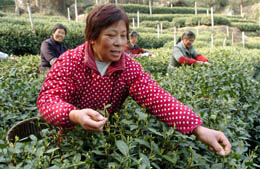 2007年3月6日,翁家山村的茶農(nóng)正在采摘西湖龍井茶。由于暖冬氣候,茶農(nóng)提前迎來(lái)西湖龍井茶的采摘期。 本報(bào)記者:王定昶