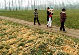 2005年1月27日上午,在河南省夏邑縣曹集鄉(xiāng)馬莊村,幾位婦女經(jīng)過(guò)一片被凍壞的麥田。全國(guó)商品糧基地縣河南省夏邑縣該年小麥種植面積達(dá)100萬(wàn)畝,遭受凍害的小麥達(dá)60萬(wàn)畝,其中15萬(wàn)畝受凍程度嚴(yán)重。(本報(bào)資料照片) |