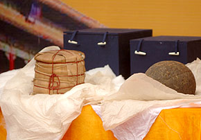 故宮珍藏的“萬壽龍團(tuán)貢茶”(右)和“七子餅”。
