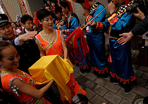“萬壽龍團(tuán)貢茶”到達(dá)返鄉(xiāng)之旅的第一站北京宣武區(qū)馬連道茶葉一條街面向市民展出。本報記者 李石磊