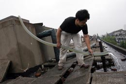 6月2日,工作人員在無錫市曹張新村的一幢居民樓頂清空水箱中的存水。在經(jīng)過專家17個(gè)小時(shí)的反復(fù)實(shí)驗(yàn)后,6月1日上午7時(shí)40分,檢測(cè)數(shù)據(jù)顯示,無錫市自來水總公司制水廠出水的臭味被成功消除。供水部門加大主水道的供水量,呼吁市民打開水龍頭放掉管道陳水。截至3日下午,無錫市出廠自來水的水質(zhì)基本合格,藍(lán)藻污染導(dǎo)致的臭味基本清除。市民除飲用和做飯仍依賴純凈水外,其他生活用水已經(jīng)正常。新華社發(fā)(宦瑋攝) | 太湖藍(lán)藻大規(guī)模暴發(fā)造成無錫市民生活用水困難,再次敲響了太湖生態(tài)環(huán)境惡化的警鐘。中國(guó)科學(xué)院南京地理與湖泊研究所對(duì)太湖生態(tài)環(huán)境狀況長(zhǎng)期研究的結(jié)果顯示:工業(yè)污染增加、農(nóng)業(yè)面源污染擴(kuò)大、城市生活污水直接入湖和漁業(yè)養(yǎng)殖規(guī)模急速擴(kuò)張是造成太湖水環(huán)境惡化的主要原因。