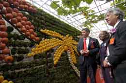山東壽光是我國北方著名的“菜籃子”,目前全市優(yōu)質(zhì)蔬菜基地已達(dá)80萬畝,年產(chǎn)優(yōu)質(zhì)蔬菜40億公斤。在中國壽光國際蔬菜科技博覽會(huì)會(huì)上,三位外國參展商被用果蔬制成的藝術(shù)造型吸引。(本報(bào)資料照片) |
