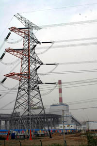 寧夏首臺600MW燃煤空冷發(fā)電機(jī)組采用世界上最先進(jìn)的空冷發(fā)電技術(shù),較傳統(tǒng)濕冷發(fā)電機(jī)組節(jié)水70%,是典型的環(huán)保發(fā)電機(jī)組。圖為華電寧夏靈武發(fā)電有限公司院內(nèi)的輸電網(wǎng)。