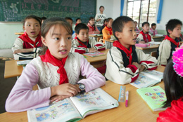 2007年,上海市教委將改善農(nóng)民工子女學(xué)校辦學(xué)條件列入年度重點(diǎn)工作。11月13日,上海浦東新區(qū)大別山小學(xué)農(nóng)民工的孩子們?cè)谟⒄Z課上朗讀單詞。新華社記者:鄭悅