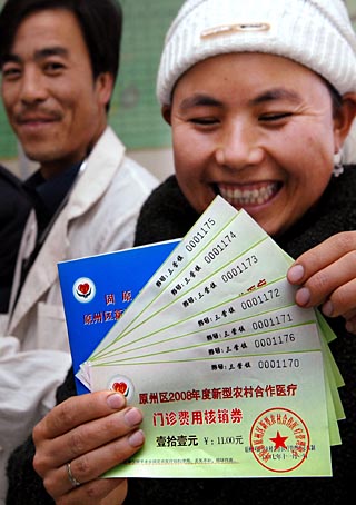 | 寧夏固原市原州區(qū)三營鎮(zhèn)華坪梁村村民李國英,高興地領(lǐng)到了2008年度的新型農(nóng)村合作醫(yī)療門診費用核銷券,解了“看病難”的憂。新華社記者