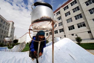 由于西藏高原離太陽(yáng)最近、日照時(shí)間長(zhǎng),綠色能源——太陽(yáng)能利用前景誘人。圖為一藏族老阿媽用太陽(yáng)灶燒茶。本報(bào)記者:覺(jué)果