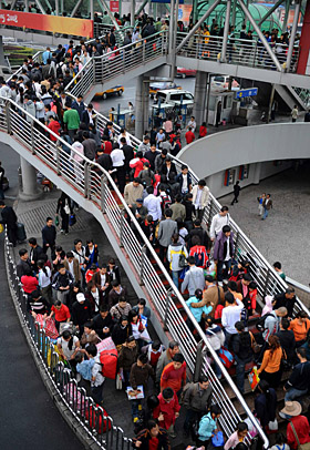 今年的十一黃金周是節(jié)假日調整后的第一個長假,深圳的各主要景點以及機場和車站人潮洶涌,好一派興旺景象。 國慶節(jié)當天,在深圳市中心通往鹽田海濱度假區(qū)的免費高速公路上,小汽車綿延10余公里,近40萬人涌向大小梅沙海灘觀光;在矗立小平銅像的蓮花山公園,登山的游客比肩接踵;在歡樂谷,大人牽著孩子排長隊入場。 |