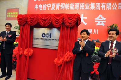12月26日,注冊資本金50億元中電投寧夏青銅峽能源鋁業(yè)集團(tuán)有限公司正式成立。寧夏政府主席王正偉(右一)與中國電力投資集團(tuán)總經(jīng)理陸啟洲(左一)等領(lǐng)導(dǎo)一起為中電投寧夏青銅峽能源鋁業(yè)集團(tuán)有限公司揭牌。本報記者:武勇