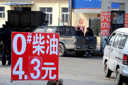 日前青島市海爾路一加油站張貼出降價后的新價格吸引顧客。本報記者:李紫恒