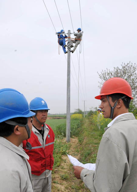 4月17日,肥西縣供電公司的電力技術(shù)人員為豐樂鎮(zhèn)程店村的電網(wǎng)線路進行改造!⌒氯A社記者 王雷 攝 |