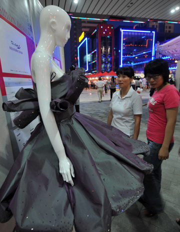 在杭州舉辦的“大學(xué)生DIY創(chuàng)意展”上,參觀者被一件杭州大學(xué)生設(shè)計(jì)制作的服飾吸引。新華社記者王定昶 攝