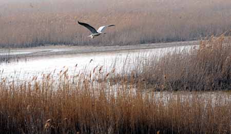 鳥兒在黃河三角洲濕地上飛翔。新華社記者:范長(zhǎng)國(guó)/攝 |