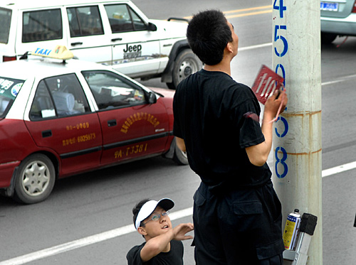 | 6月19日,工作人員在銀川市北京路一電線桿上噴涂編碼數(shù)字。銀川市警方將于近日啟動(dòng)城市編碼報(bào)警求助系統(tǒng),對(duì)主要路段及建筑物進(jìn)行數(shù)字對(duì)照編碼。警方可通過(guò)110報(bào)警者報(bào)出的數(shù)字,快速、準(zhǔn)確地判斷其所處位置并出警。 | |