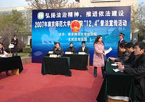 | 12月4日,第七個(gè)法制宣傳日,南京師范大學(xué)法學(xué)院學(xué)生在南京鼓樓廣場(chǎng)舉辦普法活動(dòng),現(xiàn)場(chǎng)咨詢、有獎(jiǎng)問(wèn)答、模擬法庭,吸引了市民廣泛參與。新華社記者 凌軍輝