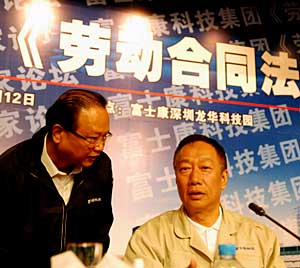 | 富士康科技集團12日在深圳舉行《勞動合同法》專題論壇,邀請勞動部、國臺辦、全國總工會等相關部門的專家解答了企業(yè)和員工的疑問。富士康表示,將積極實施《勞動合同法》,與數萬已連續(xù)工作8年以上的員工簽訂無固定期限勞動合同。富士康科技集團總裁郭臺銘(右者)在研討會上表示,富士康將積極實施《勞動合同法》,全力推動有富士康特色的勞動合同制度,創(chuàng)造勞資雙贏、留住人才的局面,同時積極履行《勞動合同法》規(guī)定的法律責任,做到合法經營。新華社記者