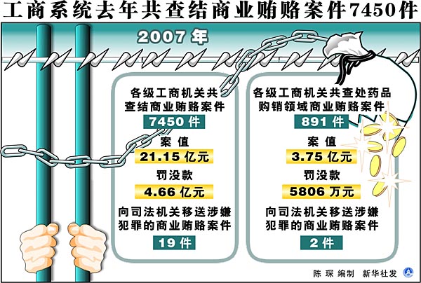 工商系統(tǒng)2007年共查結(jié)商業(yè)賄賂案件7450件