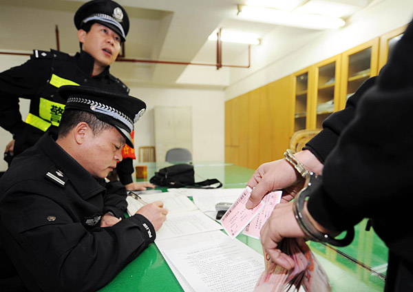 1月5日,福州鐵路公安處福州站派出所的民警為抓獲的車站扒手做筆錄。近日,福州鐵路公安處福州站派出所啟動(dòng)為期3個(gè)月的“鐵鷹”專項(xiàng)行動(dòng),嚴(yán)密防范和嚴(yán)厲打擊流竄犯罪活動(dòng),大力凈化春運(yùn)期間火車站的治安環(huán)境。