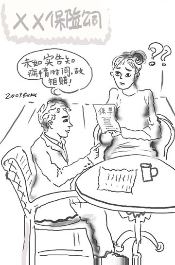 案例:劉先生腸胃不好,由于工作忙一直沒(méi)有去醫(yī)院檢查,每次肚子疼就吃一些胃藥來(lái)減輕病痛。2006年12月30日,他遇到了一位保險(xiǎn)公司業(yè)務(wù)員上門推銷保險(xiǎn),就購(gòu)買了10萬(wàn)元的重大疾病保險(xiǎn)。 在填寫投保單健康告知欄目時(shí),關(guān)于“最近5年是否曾有腹痛癥狀和最近有沒(méi)有服用藥物”詢問(wèn)內(nèi)容,劉先生咨詢業(yè)務(wù)人員是否需要將自己的胃痛填寫上,業(yè)務(wù)人員問(wèn)劉先生是否在醫(yī)院有病例證明,劉先生說(shuō)沒(méi)有,業(yè)務(wù)人員就說(shuō)沒(méi)事,讓劉先生不要填寫。劉先生當(dāng)時(shí)就按照業(yè)務(wù)人員的說(shuō)法在此項(xiàng)勾選了“否”。 2008年1月,劉先生忽感身體不適,胃部奇痛,到醫(yī)院就診。醫(yī)生問(wèn)詢劉先生之前胃部是否有過(guò)毛病,劉先生說(shuō)胃疼史有4年并服用過(guò)胃藥,醫(yī)生將劉先生口述寫入了病例。經(jīng)過(guò)全面檢查,劉先生被確診為胃癌晚期。后診治無(wú)效,劉先生不幸病故,所花醫(yī)療費(fèi)共計(jì)14萬(wàn)元。 事故發(fā)生后,劉先生家屬劉太太及時(shí)通過(guò)全國(guó)服務(wù)熱線報(bào)了案。經(jīng)審核,資料齊全,公司予以受理。但15個(gè)工作日后,保險(xiǎn)公司下發(fā)了拒賠通知單,拒賠理由為:被保險(xiǎn)人病例中本人陳述有4年胃痛史,早于投保時(shí)間,但被保險(xiǎn)人劉先生在投保時(shí)并未如實(shí)告知胃痛情況,未履行如實(shí)告知義務(wù),故保險(xiǎn)公司拒絕賠償。