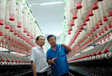 河南延津縣積極進行金融創(chuàng)新,幫扶中小企業(yè)。圖為農(nóng)信社工作人員(左)在延津棉紡織廠查看車間生產(chǎn)情況。針對當?shù)刂行∑髽I(yè)融資難、貸款難的問題,河南延津縣農(nóng)信社推出多種金融創(chuàng)新產(chǎn)品,對企業(yè)進行信用等級評定,提供資金支持,幫助企業(yè)渡過難關(guān)。新華社發(fā)張保柱