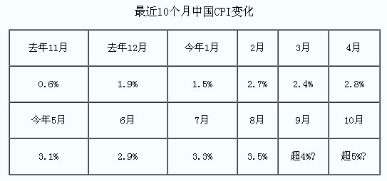 然而,4萬億的中央投資計劃、十大產(chǎn)業(yè)振興規(guī)劃,以及10萬億的新增貸款投放,極大地刺激了中國經(jīng)濟的快速復蘇與CPI的持續(xù)反彈。自2009年11月以來,中國CPI已連續(xù)上漲10個月,并有不斷攀升之勢。