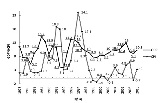 圖中用CPI(居民消費價格指數(shù))表示的物價水平波動曲線顯示,1978—2010年,物價波動的波峰年即最高通貨膨脹率發(fā)生的年份分別是1980年(7.5%)、1988年(18.8%)、1994年(24.1%)和2007年(5.9%);而波谷年即最低通貨膨脹率發(fā)生的年份分別是1982年或1983年(均為2%)、1990年(3.1%)、1999年(-1.4%)和2009年(-0.7%)。從物價波動的波峰年來看,1980年到2007年的27年間共經(jīng)歷了3個周期,周期的平均長度是9年。從物價水平波動的波谷年來看,1982年到2009年的27年間也經(jīng)歷了3個周期,周期的平均長度也是9年。
