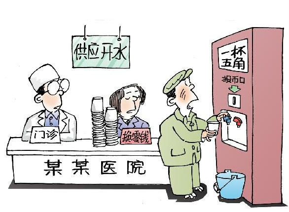 最近,昆明市部分醫(yī)院“賣開水”現(xiàn)象引起關注,此舉被一些院方解釋為“遏制浪費”“杜絕資產(chǎn)流失”,但患者不樂意了,“我來你這兒看病,喝杯開水還要掏錢?”究竟是遏制浪費,還是另有企圖?醫(yī)療機構“賣開水”背后,其實暗藏公益行為與公眾素質(zhì)之間的對壘。記者在昆明市兒童醫(yī)院調(diào)查發(fā)現(xiàn),門診大廳、住院部都設置了投幣式開水器,患者要喝一杯600毫升左右的開水,必須投幣5角;為“方便”患者投幣,大廳一側的小賣部還專設了硬幣兌換點。常帶孩子來就診的陳女士反映,兒童醫(yī)院的換幣買水現(xiàn)象已經(jīng)持續(xù)很長時間了,“醫(yī)院真是掉錢眼里了,怎么能這樣對待患者呢?作為公共服務機構,醫(yī)院應該像機場、車站一樣,免費提供飲用水!”