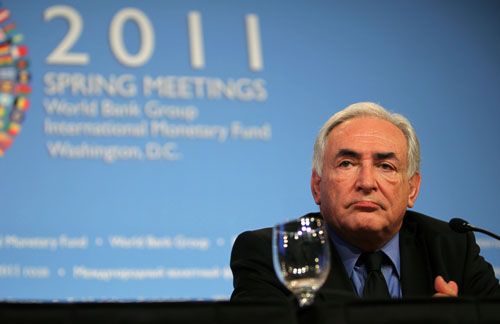 5月14日,國際貨幣基金組織(IMF)總裁多米尼克·斯特勞斯-卡恩因涉嫌對酒店女傭進(jìn)行“性侵犯”在美國紐約被拘捕。 圖為4月14日,斯特勞斯-卡恩在美國首都華盛頓出席新聞發(fā)布會的資料照片。(記者