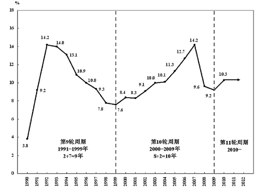 新中國成立以來,從1953年開始大規(guī)模經(jīng)濟建設(shè)、進入工業(yè)化歷程到2009年,經(jīng)濟增長率(國內(nèi)生產(chǎn)總值增長率)的波動共經(jīng)歷了10輪周期,2010年又進入了新一輪即第十一輪周期。