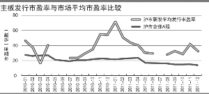 圖三:滬市發(fā)行市盈率與市場(chǎng)平均市盈率比較