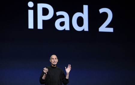 iPad的新款又推出了,但中國的iPad的商標(biāo)權(quán)并不在蘋果之手。 圖為2011年3月2日,蘋果公司首席執(zhí)行官史蒂夫·喬布斯在美國舊金山舉行的新產(chǎn)品發(fā)布會上介紹iPad2。當(dāng)天,美國蘋果公司推出新一代平板電腦iPad2。 資料照片 |