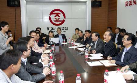 2011年10月,國(guó)務(wù)院總理溫家寶來(lái)到浙江紹興和溫州,深入農(nóng)村、社區(qū)、企業(yè)和市場(chǎng),看望廣大干部群眾,就經(jīng)濟(jì)運(yùn)行情況進(jìn)行調(diào)研。 圖為溫家寶在紹興縣匯金小額貸款公司考察,詳細(xì)詢問(wèn)小額貸款公司和民間信貸的情況,認(rèn)真聽(tīng)取大家的意見(jiàn)和建議。(資料照片) |