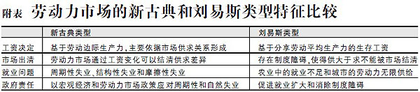 中國勞動力市場正在從二元經(jīng)濟(jì)所對應(yīng)的模式轉(zhuǎn)向與新古典經(jīng)濟(jì)相對應(yīng)的模式,勞動力市場的表現(xiàn)既存有二元經(jīng)濟(jì)特征又表現(xiàn)出一定的新古典模式特點(diǎn)。因此,在認(rèn)識二元經(jīng)濟(jì)下勞動力市場性質(zhì)的基礎(chǔ)上,也需要把握新古典模式下的勞動力市場的相關(guān)特征,因?yàn)檫^去階段的一些特征仍然存在,而后者在一定程度上也是轉(zhuǎn)型的目標(biāo)所指。我們可以嘗試借鑒這兩種分析框架來認(rèn)識當(dāng)前問題。我們先把新古典模式的勞動力市場與劉易斯勞動力市場類型進(jìn)行對比(見附表)。通過對比,我們可以了解,當(dāng)前我們的勞動力市場特征既不是純粹的二元經(jīng)濟(jì)結(jié)構(gòu),也不是典型的新古典模式。