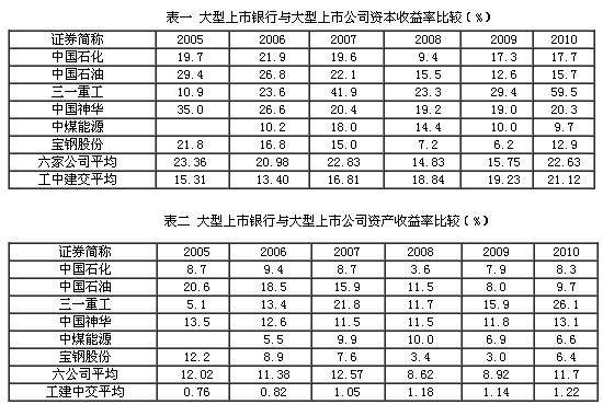 表一、表二中選擇了工中建交四家國有上市銀行和六家實(shí)體經(jīng)濟(jì)上市公司,縱向分析它們在2005-2010年期間的效益增長情況。其數(shù)據(jù)對比說明,六家實(shí)體經(jīng)濟(jì)公司不僅平均資產(chǎn)收益率遠(yuǎn)遠(yuǎn)高于四家國有銀行的平均水平,而且其平均資本收益率在其中的四年內(nèi)也高于四家國有銀行的平均水平。所不同的是,四家國有銀行的平均資本收益率與資產(chǎn)收益率在六年中呈逐年上升的趨勢,而六家實(shí)體經(jīng)濟(jì)公司中,除“三一重工”與“中國神華”外,其他四家的資本收益率與資產(chǎn)收益率均呈現(xiàn)波動明顯、逐年下降的趨勢。