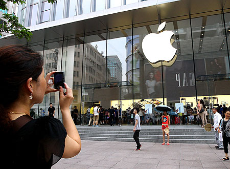 我們艷羨蘋果,但蘋果的魅力和威力是建立在雄厚的知識產(chǎn)權(quán)資產(chǎn)之上的。蘋果公司擁有260件以上的商標(biāo),僅2011年在美國就申請了676件專利。圖為7月12日,游客在上海南京路上的蘋果專賣店前拍照。記者 陳飛 攝 |