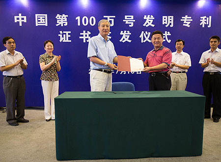 7月16日,國家知識產(chǎn)權(quán)局局長田力普(左三)向發(fā)明專利權(quán)利人北京農(nóng)業(yè)信息技術(shù)研究中心的負(fù)責(zé)人頒發(fā)證書。此次簽發(fā)的第100萬號授權(quán)發(fā)明專利名稱為“一種虛擬玉米葉片模型可控面元劃分方法”。自1985年授權(quán)首件發(fā)明專利以來,至今年7月11日,我國27年時間里發(fā)明專利累計授權(quán)量達到100萬件,成為世界上達到這個目標(biāo)耗時最短的國家。但是,我們的專利擁有總量、國民人均擁有量、專利轉(zhuǎn)化率,還遠遠落后于許多領(lǐng)先的創(chuàng)新性國家。記者 金立旺 攝 |