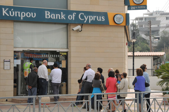4月3日,在塞浦路斯首都尼科西亞,儲戶們在一家塞浦路斯銀行前排隊等待辦理銀行業(yè)務。記者 徐聰