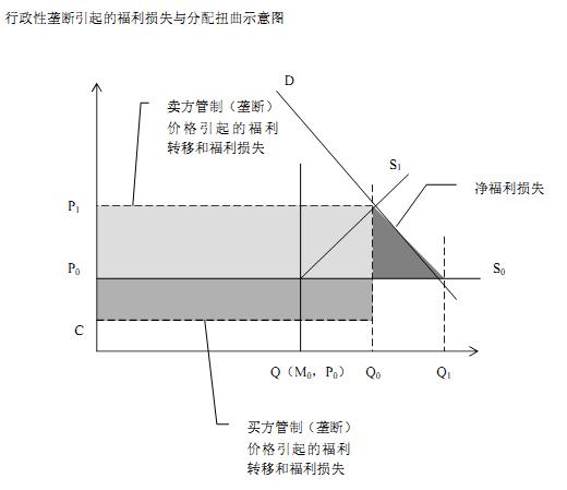 【說明:圖中深灰色部分是行政性壟斷帶來的社會福利凈損失,我們稱之為“社會福利損失一”;圖中淺灰色部分是由壟斷(管制)價(jià)格帶來的分配扭曲部分,我們稱之為行政性壟斷的“社會福利損失二”;圖中灰色部分是買方的壟斷(管制)價(jià)格(即較低或零的資源價(jià)格)帶來的分配扭曲,我們稱之為行政性壟斷的“社會福利損失三”!