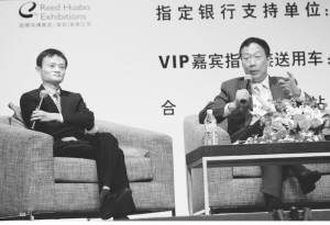 | 馬云與臺(tái)灣鴻海集團(tuán)董事長郭臺(tái)銘在網(wǎng)商大會(huì)上對(duì)話。IC圖片 | 轉(zhuǎn)型綜合交易平臺(tái)