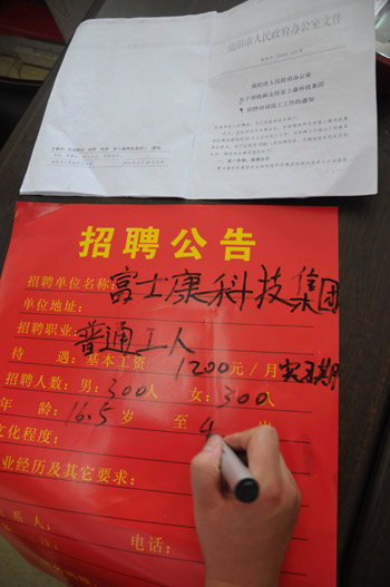 河南南陽(yáng)市臥龍區(qū)人力資源市場(chǎng)的工作人員抄寫富士康招聘公告。付海厚
