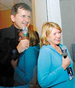 美國(guó)“家政女王”瑪莎`·斯圖爾特6日抵達(dá)哈薩克斯坦拜科努爾發(fā)射場(chǎng),探望希莫尼,這引起人們對(duì)兩人親密關(guān)系的眾多猜測(cè)。 為迎接即將到來(lái)的太空旅行,希莫尼和同行宇航員必須與他人隔離。因此,希莫尼隔著玻璃窗與斯圖爾特竊竊私語(yǔ),依依惜別。斯圖爾特仍通過(guò)話筒傳達(dá)對(duì)希莫尼的鼓勵(lì):“你看起來(lái)很好!每個(gè)人都說(shuō)你狀態(tài)不錯(cuò)!” 也許是由于情緒激動(dòng),希莫尼握著話筒的手不停地顫抖著,他還安慰斯圖爾特,說(shuō)自己一點(diǎn)都不緊張。他說(shuō):“我昨晚睡得非常好,我相信今晚也會(huì)睡得不錯(cuò)!