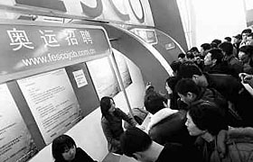 2月17日開幕的2008年北京春季招聘會(huì)首次設(shè)立了奧運(yùn)專場(chǎng),部分奧運(yùn)供應(yīng)商、服務(wù)商現(xiàn)場(chǎng)攬才。其中,一家中介機(jī)構(gòu)為外資企業(yè)在奧運(yùn)期間招聘400名司機(jī),打出了最高8000元的月薪。吳長(zhǎng)青/攝 |