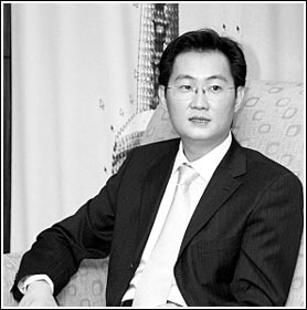 一襲黑色的西裝,配上淡粉色的領(lǐng)帶,年輕的臉龐看起來(lái)并不像是市值上百億的企業(yè)董事會(huì)主席。他就是被譽(yù)為擁有7億民眾的“ QQ 幫主”馬化騰。