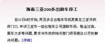 | 引發(fā)三亞出租車(chē)罷運(yùn)的導(dǎo)火索,諸如“份錢(qián)過(guò)高”、“黑車(chē)橫行”等,幾乎與重慶出租車(chē)罷運(yùn)事件毫無(wú)二致。如果存在于國(guó)內(nèi)出租車(chē)業(yè)“份錢(qián)過(guò)高”的通病,都需要以出租車(chē)司機(jī)罷運(yùn)的方式來(lái)解決,更將對(duì)社會(huì)矛盾的求解起到一個(gè)非常不好的示范效應(yīng)。[詳情] | |